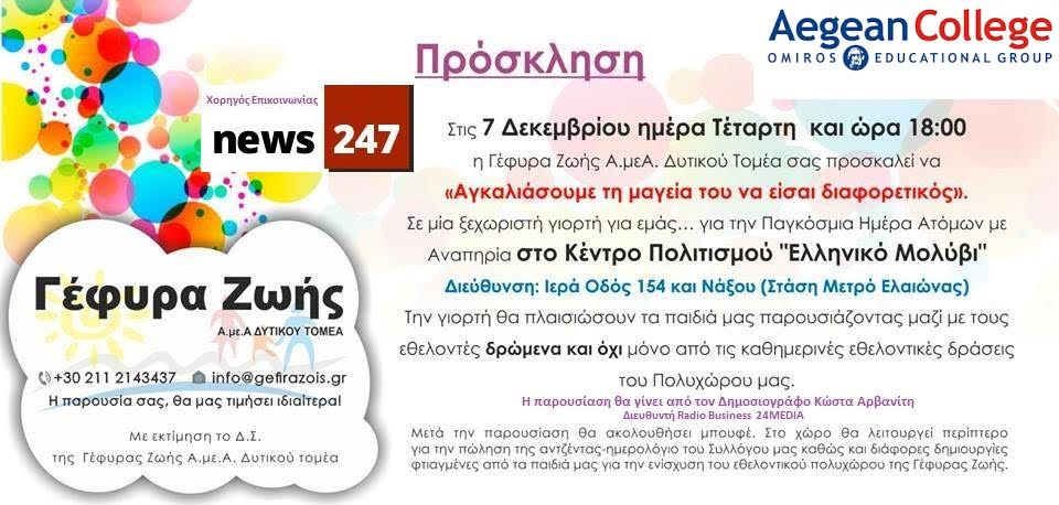 Η Γέφυρα Ζωής ΑΜΕΑ Δυτικού Τομέα σας προσκαλεί στην ετήσια γιορτή της στις 7 Δεκεμβρίου & ώρα 18:00 στο Πολιτιστικό Κέντρο του Δήμου Αιγάλεω «Ελληνικό Μολύβι»